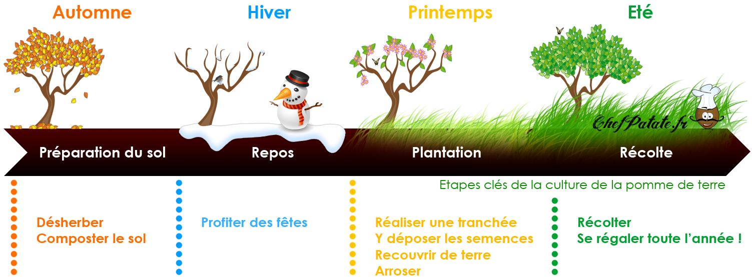 Le maitre mot est « patience ». Ne vous précipitez pas pour planter vos patates. Attendez que le sol soit suffisamment réchauffé (au moins 10°C) et sec. Un sol trop froid et trop humide risque de faire « pourrir » vos semences. D’une manière générale, ne plantez pas avant le début du printemps dans les régions à climat doux. Dans les autres régions attendez le milieu du printemps voire la fin du printemps dans les régions les plus froides.